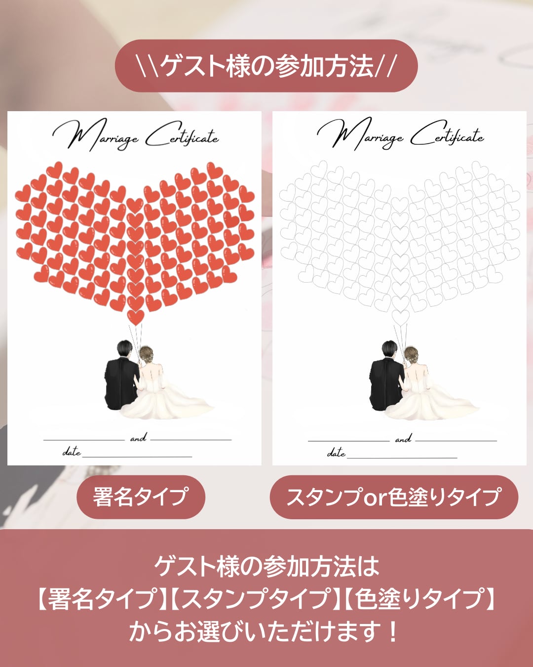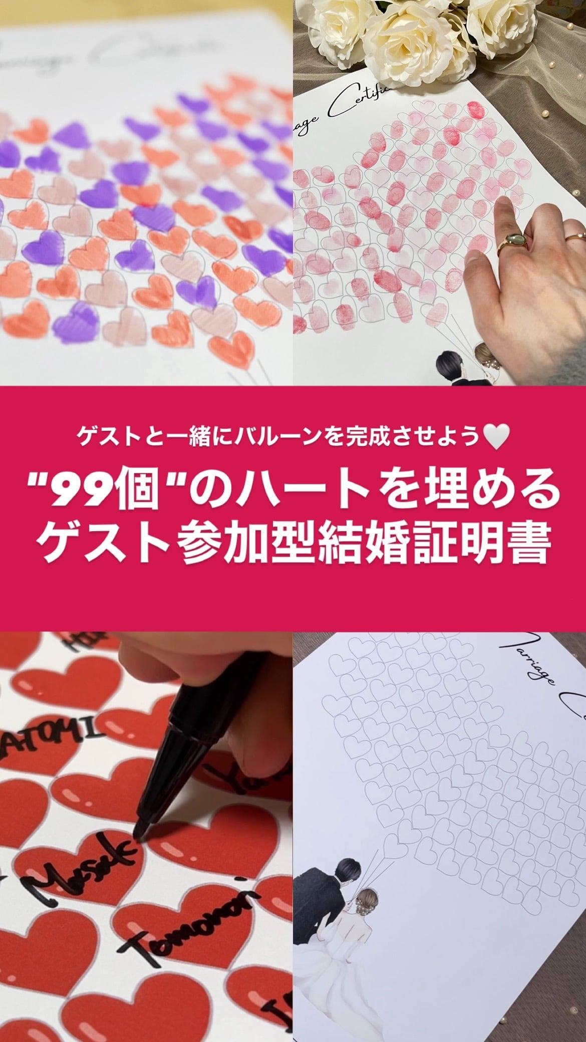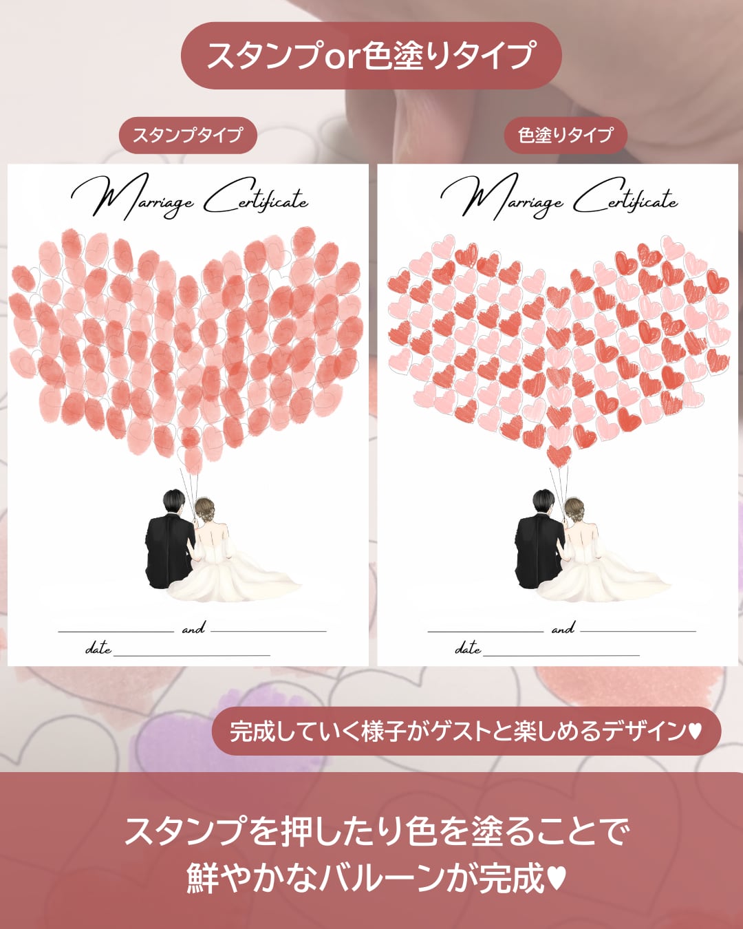ゲストの皆さんと一緒に、指印やスタンプ、色鉛筆で色付けしてつくる参加型の結婚証明書です!