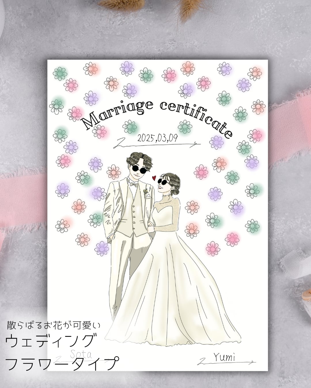 但し、デザインの大幅な変更(結婚証明書の場合、ウェディングツリーからブーケへの変更etc)は御遠慮頂いております。