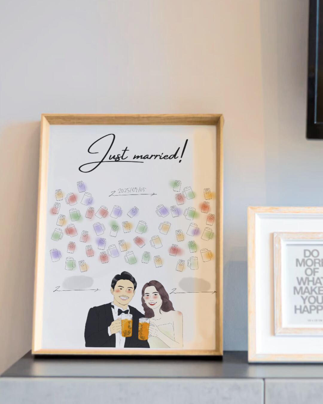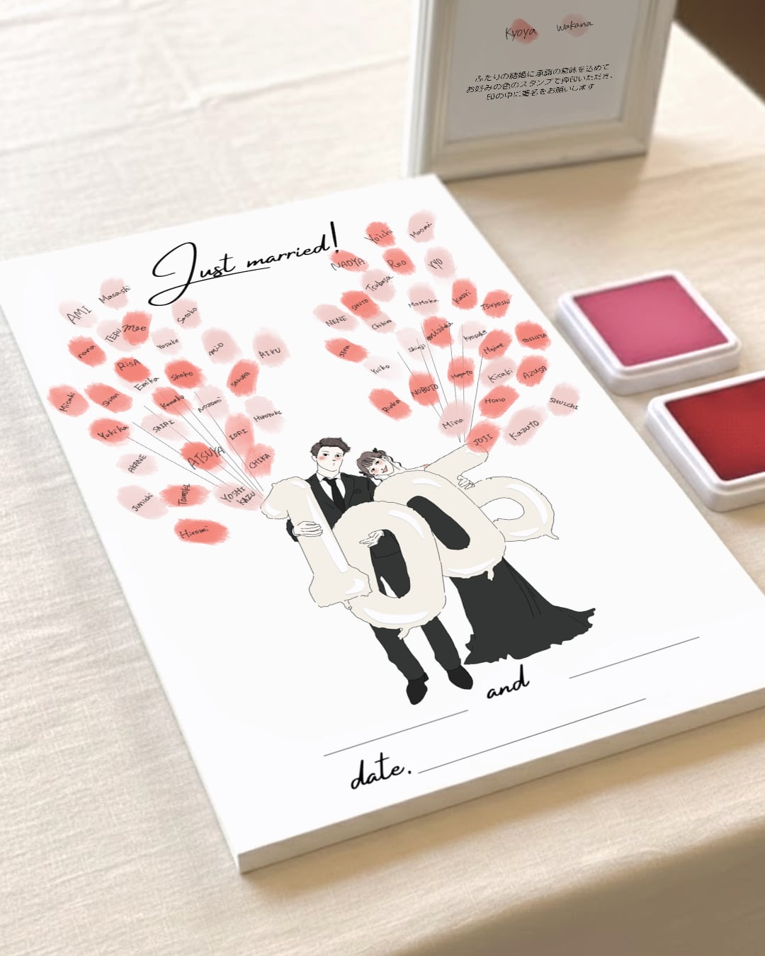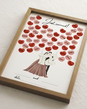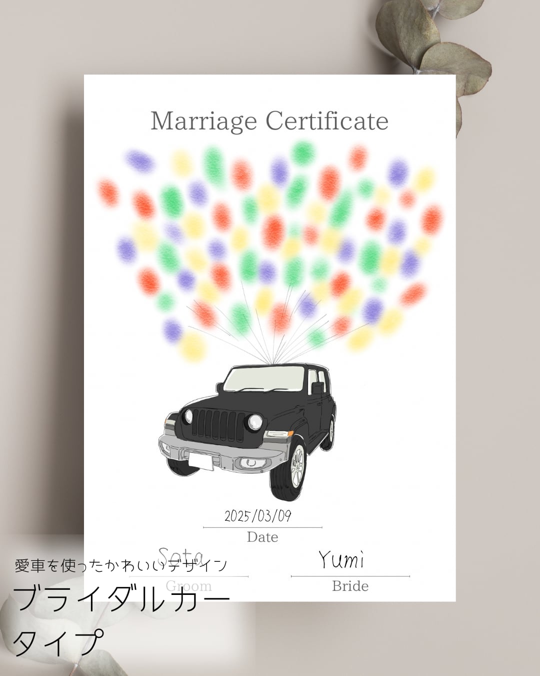 ゲストの皆さんと一緒に、指印やスタンプ、色鉛筆で色付けしてつくる参加型の結婚証明書です!